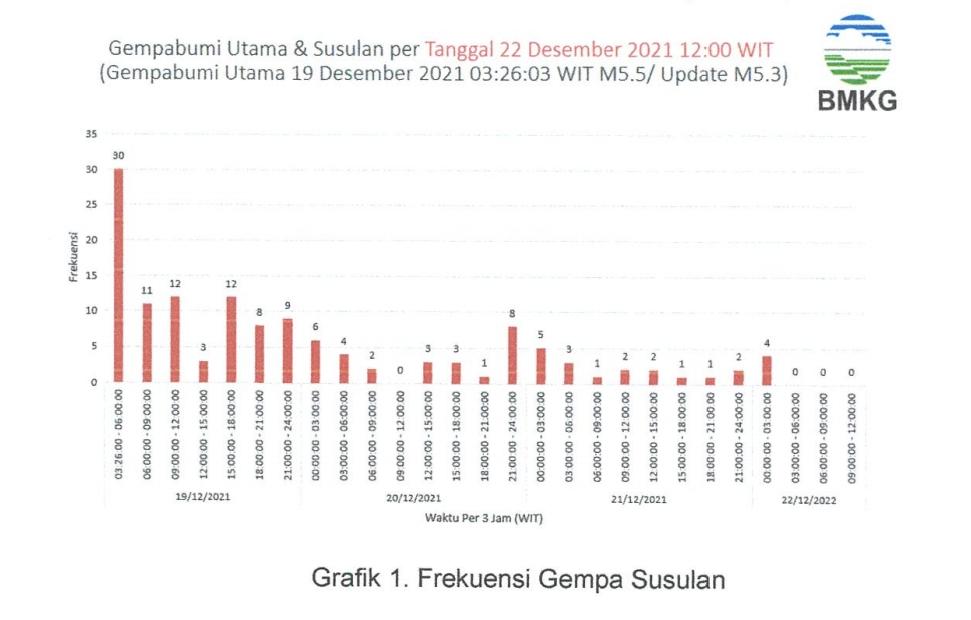 3. Berdasarkan monitoring gempa bumi susulan yang terjadi dari gempa utama pada tanggal 19 Desember menunjukkan telah terjadi 122 kali gempa susulan (aftershock) dengan magnitudo gempa susulan terbesar mencapai 4,9 sedangkan magnitudo gempa susulan terkecil 1,8.