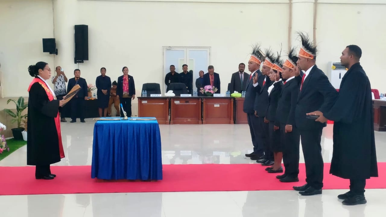 Pelantikan ditandai sumpah dan janji, penandatanganan berita cara dan pembacaan naskah pelantikan yang dipimpin oleh Ketua Pengadilan Negeri Sorong, Helmin Somalay.