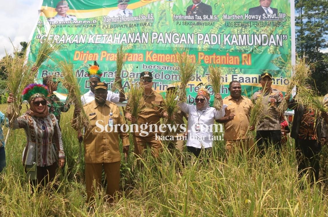 MAYBRAT, PBD- Direktur Pembiayaan Pertanian, Kementerian Pertanian RI, Dr. Indah Megahwati didampingi Penjabat (Pj) Bupati Maybrat, Bernhard Rondonuwu, Kepala Dinas Pertanian, Marthen Howay, panen raya padi bersama kelompok tani (Poktan) di Kampung Faankahrio, Distrik Aifat Timur Tengah, Kabupaten Maybrat, Papua Barat Daya, Selasa (2/4/24).