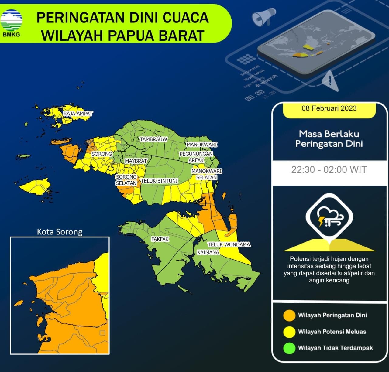 Sebelumnya, BMKG memprediksikan melalui peringatan dini akan terjadi hujan lebat disertai angin kencang dan petir di wilayah Sorong Raya Papua Barat Daya pada pukul 22.30 WIT sampai pukul 02.00 WIT. (Oke)