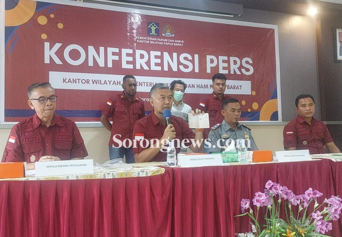 Hal itu terungkap dan disampaikan langsung oleh Kepala Divisi Keimigrasian Kanwil Kemenkumham Papua Barat, Achmad Brahmantyo Machmud didampingi Kabid Inteldakim James Smart J. Sembel, Kepala Kantor Imigrasi Kelas II TPI Sorong Daud Randa Payung serta Penyidik Pegawai Negeri Sipil (PPNS), Wawan A Mido saat menggelar konferensi pers, bertempat di Aula Kantor Imigrasi Kelas II TPI Sorong, Kota Sorong, Jumat (12/7/24).