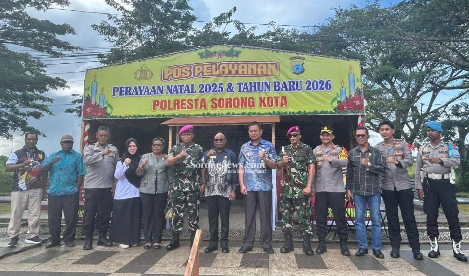 SORONG, PBD – Wali Kota Sorong Septinus Lobat, didampingi Wakil Wali Kota Sorong Anshar Karim bersama jajaran Forum Komunikasi Pimpinan Daerah (Forkopimda) Kota Sorong melakukan peninjauan ke lima Pos Pengamanan Natal dan Tahun Baru (Nataru) di wilayah Kota Sorong, Papua Barat Daya, Rabu (24/12/25).