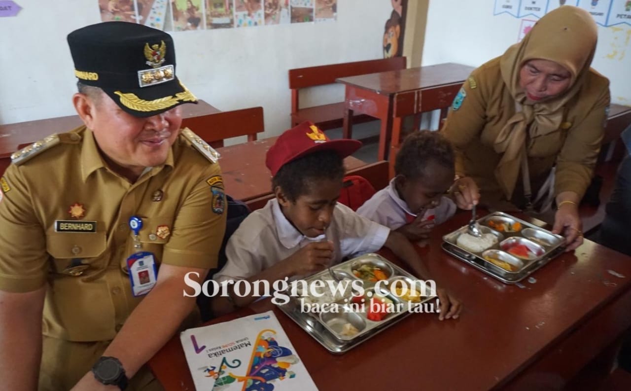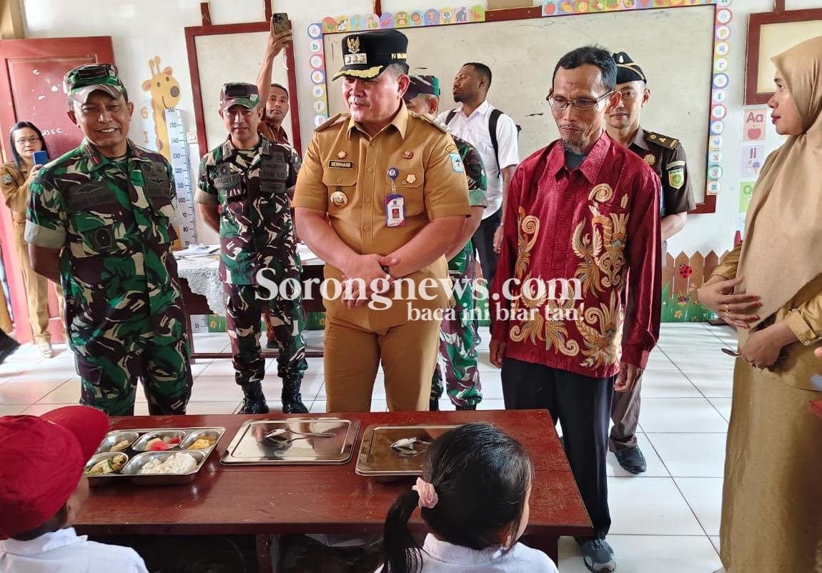 Penjabat Wali Kota Sorong, Bernhard Rondonuwu didampingi Danrem 181 PVT, Brigjen TNI Totok Sutriono dan Dandim 1802 Sorong, Letkol Czi Angga Wijaya, Kepala Dinas Pendidikan Kota Sorong, Arby Wiliam Mamangsa, melakukan pengecekan pelaksanaan program tersebut di SD Negeri 12 Rufei Kota Sorong.
