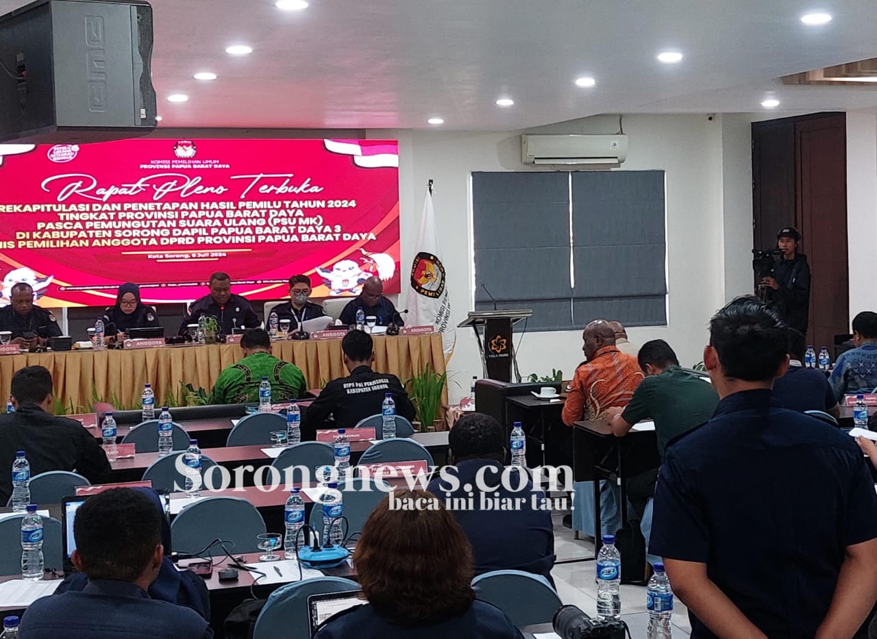 SORONG, PBD – Komisi Pemilihan Umum (KPU) Papua Barat Daya menggelar rapat pleno terbuka rekapitulasi dan penetapan hasil Pemilu tahun 2024 tingkat Provinsi Papua Barat Daya pasca Pemungutan Suara Ulang (PSU MK) di Kabupaten Sorong Dapil Papua Barat Daya III jenis pemilihan Anggota DPRD Provinsi Papua Barat Daya bertempat di salah satu hotel di Kota Sorong, Sabtu (6/7/24).