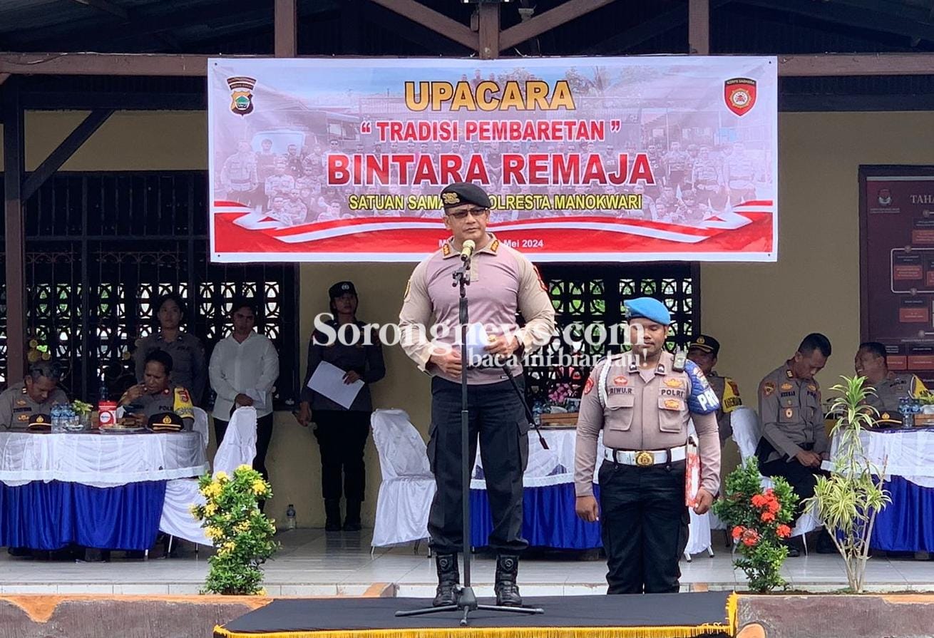 MANOKWARI, PAPUA BARAT- Polresta Manokwari gelar upacara tradisi pembaretan Bintara remaja Samapta di  Mapolresta Manokwari, Papua Barat, Kamis (16/5/24).