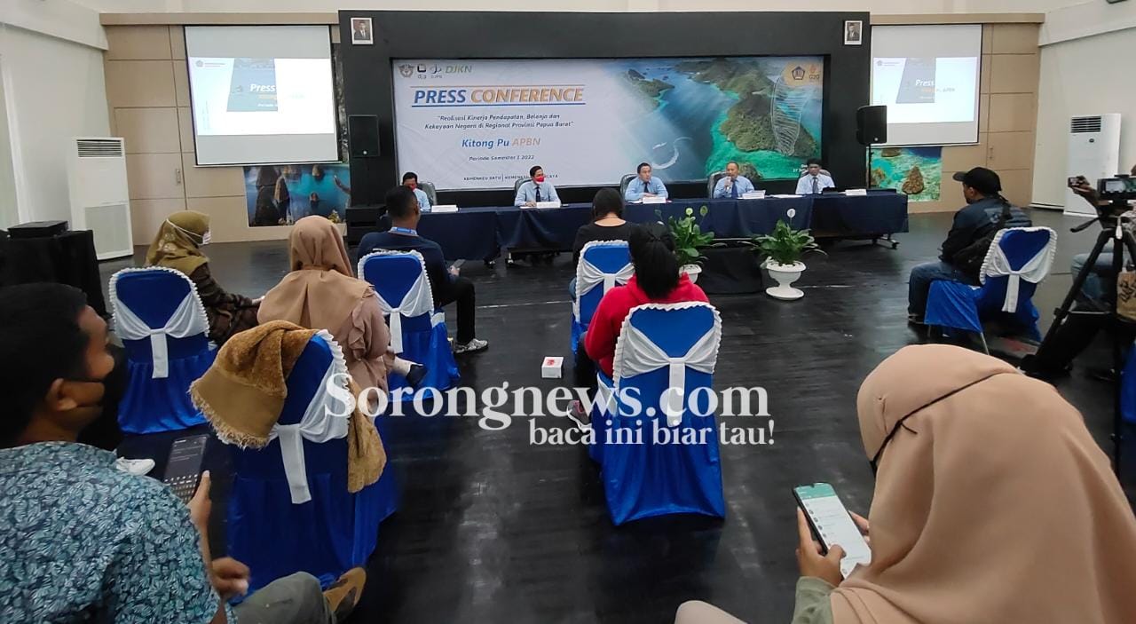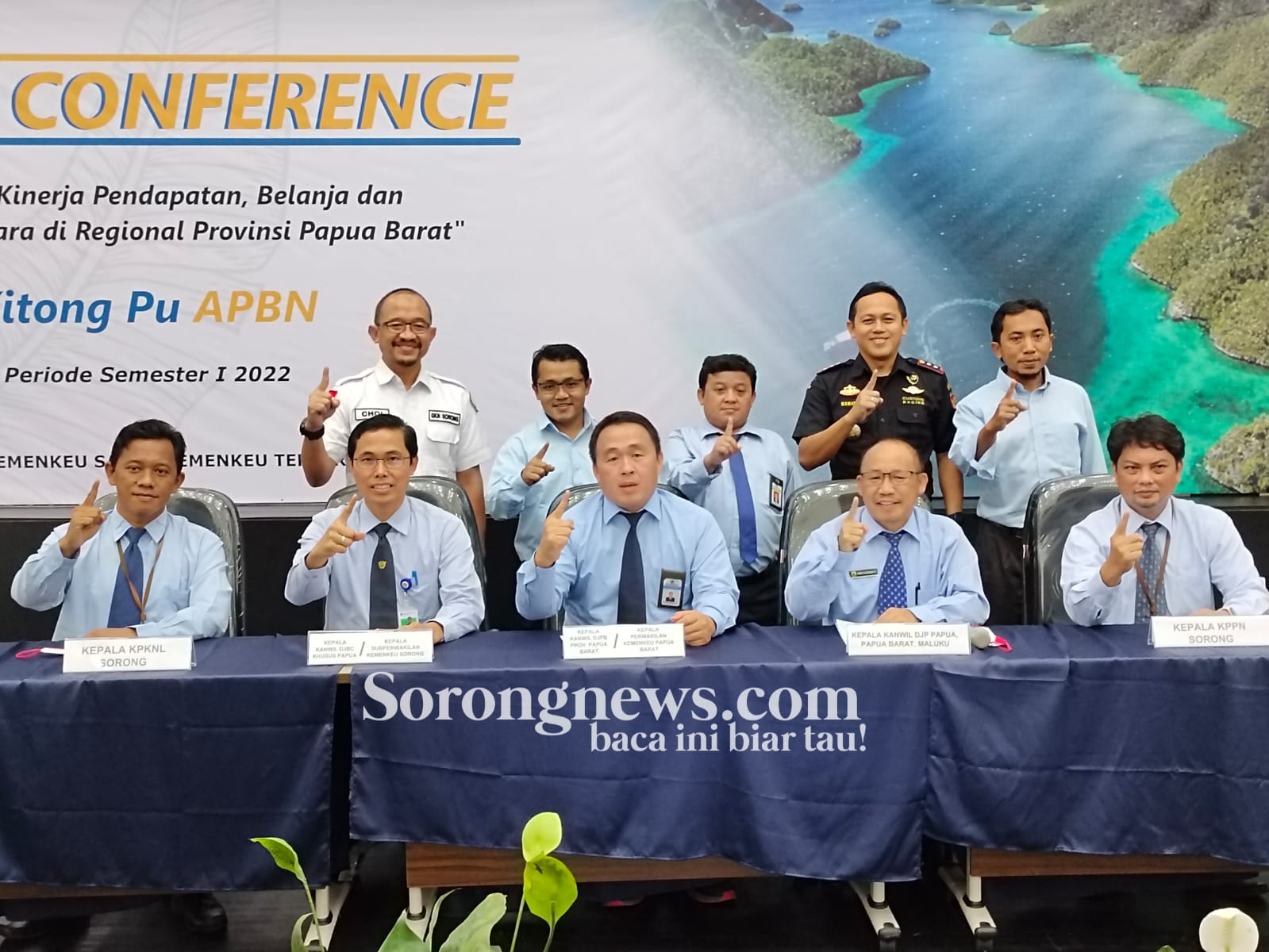 SORONG, – Kepala perwakilan Kementerian Keuangan Papua Barat, Bayu Andy Prasetya didampingi Kepala sub perwakilan Kemenkeu DJBC Papua Barat Gatot Sugeng Wibowo, Kepala DJP Papua, Papua Barat dan Maluku Heri Kuswanto, Kepala KPKNL Sorong, Antonius Arie Wibowo dan Kepala KPPN Sorong Budi Hartadi mengumumkan capaian kementerian keuangan dalam penyerapan Anggaran Pendapatan Belanja Negara (APBN) di wilayah Papua Barat pada semester I tahun 2022.