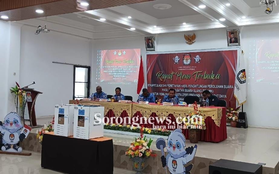 Komisi Pemilihan Umum (KPU) Kabupaten Sorong menggelar rapat pleno terbuka rekapitulasi dan penetapan hasil penghitungan perolehan suara ulang (PSU-MK) untuk jenis pemilihan anggota DPRD Provinsi Papua Barat Daya Dapil III tingkat Distrik Aimas, bertempat di Aquarius Hotel, Kabupaten Sorong, Selasa (2/7/24).