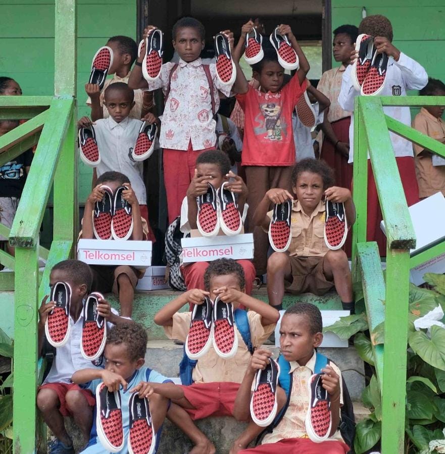 JAYAPURA, PAPUA – Telkomsel menyerahkan ratusan pasang sepatu hasil donasi pelanggan kepada sejumlah pelajar di Papua. Penyerahan donasi merupakan bagian dari rangkaian program donasi melalui penukaran Telkomsel Poin pelanggan yang dilakukan selama periode Desember 2023 hingga Januari 2024, dalam rangka menyambut Tahun Baru 2024.