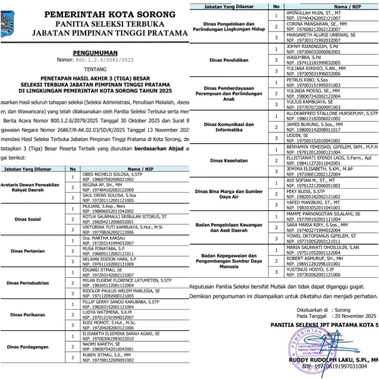 Panitia seleksi JPT Pratama Kota Sorong, Ruddy Rudolph Laku dalam surat yang ditanda tangani 20 November, mencantumkan nama-nama tersebut sesuai Surat Badan Kepegawaian Negara (BKN) Nomor 26867/R-AK.02.03/SD/K/2025 tanggal 13 November 2025 merekomendasikan hasil seleksi terbuka tersebut.
