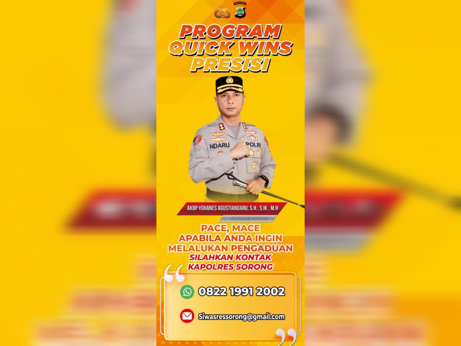 Lebih lanjut, dijelaskannya, dalam program Quick Wins Presisi, terdapat layanan media sosial yang mencantumkan dirinya sebagai Kapolres Sorong, sehingga kedepannya masyarakat dapat mengadukan terkait kinerja kepolisian melalui saluran WhatsApp (WA) yang telah tertera itu.