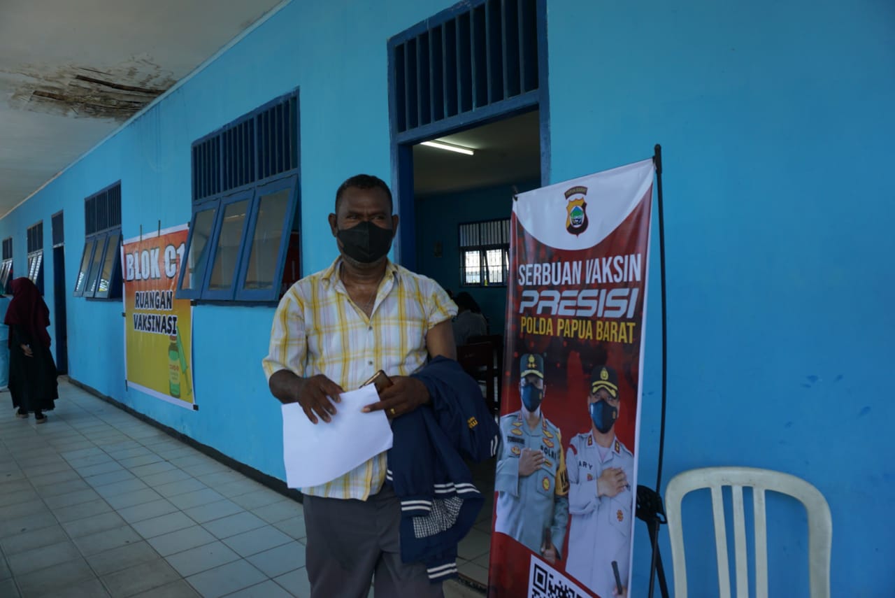 SORONG, – Matias Paul Aibekob menjadi salah satu warga yang memanfaatkan serbuan vaksinasi yang digelar Polda Papua Barat, Jumat (30/7/21) di SMKN 1 Kota Soronf, Papua Barat.