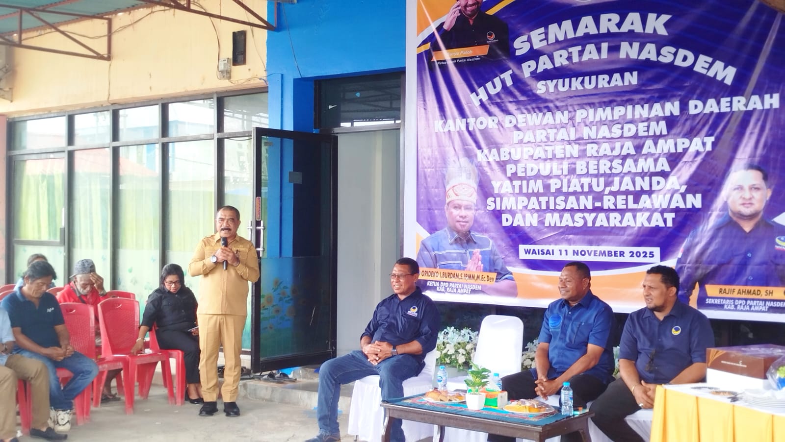 Acara HUT Partai NasDem ke 14 dan peresmian Sekretariat DPD Partai Nasdem Raja Ampat tersebut dikemas dengan kegiatan peduli bersama yatim piatu, janda, simpatisan, relawan, dan masyarakat.(David)
